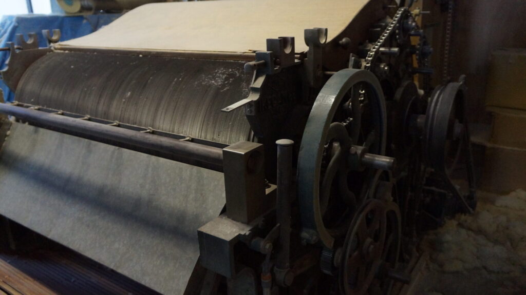 弊社では成型機(↑の写真)で開綿して除塵・綿の成型をします。壊れた繊維はふるい落とされ目減りするので新しい綿を追加します。