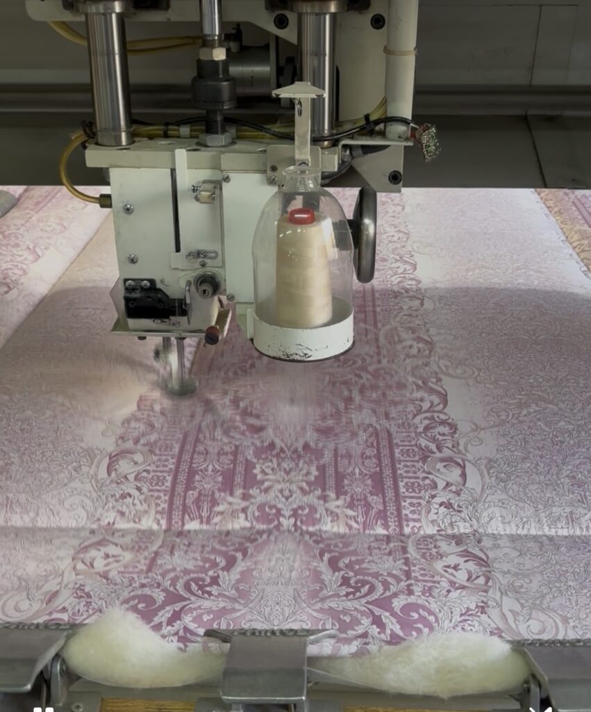 *中込寝具では打ち直ししやすいキルトパターンを開発してます。中2本縦キルトで一筆書きで縫える工夫がしてあります。このキルトパターンを見たら弊社の考えたものです。他の布団工場でもこのパターンが広がれば羊毛打ち直しが出来る確率が増えるのでフリーでデータを渡しています。